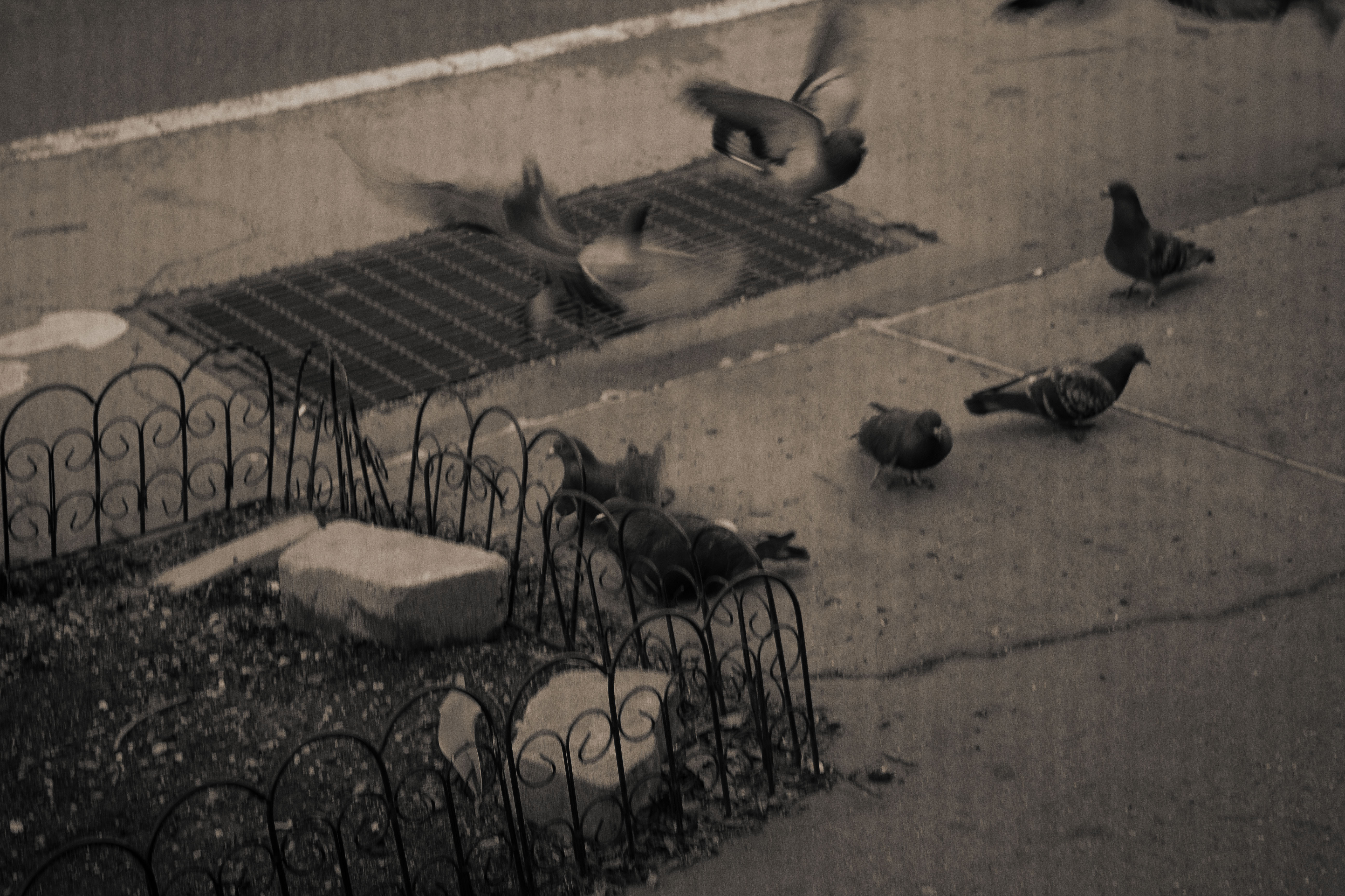 Watching them, I’ve started to notice the hidden structures of the city itself. The way a sidewalk narrows near scaffolding creates a bottleneck, not just for people, but for birds. Ledges, railings, and trash cans become nodes in an urban network. A curb is a boundary line; a bench is a gathering point. A passing truck creates a temporary force field, pushing bodies outward before they fold back in. Even the air is reshaped by alleyways, pockets of stillness, and sudden Atlantic gusts that redirect flight paths midair. There is a kind of intelligence embedded in their movement, a collective awareness. No single pigeon is directing the group, yet together they form something coordinated. It reminded me of the way crowds move through the city streets during rush hour: each person adjusting subconsciously to everyone else. We like to think that we are moving independently, but we are constantly responding to subtle cues: a shoulder turning, a foot stepping, a hesitation in someone’s pace. The pigeons make this invisible dance tangible. They exaggerate it, externalize it, turn it into something you can actually watch unfold in real time. In that way, they aren’t just adapting to the city, but they are modeling a way of existing within it.